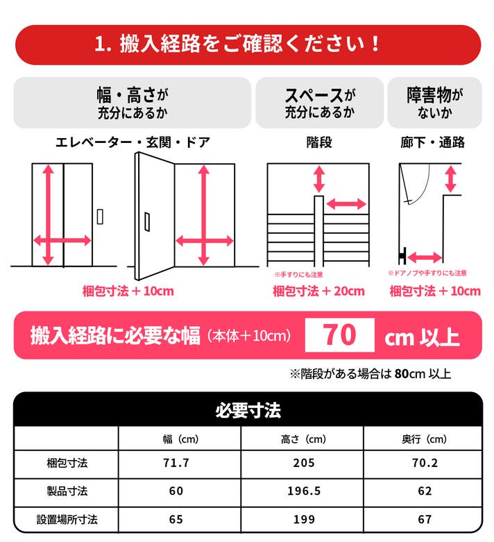 搬入経路と設置場所を必ず事前にご確認ください。