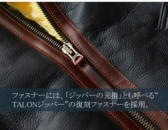 フロントには重厚なTALONジッパーの復刻モデルを採用。長年の使用にも耐えうる堅牢さと、経年変化を楽しめる味わい深さが魅力です。
