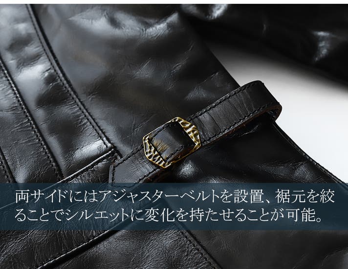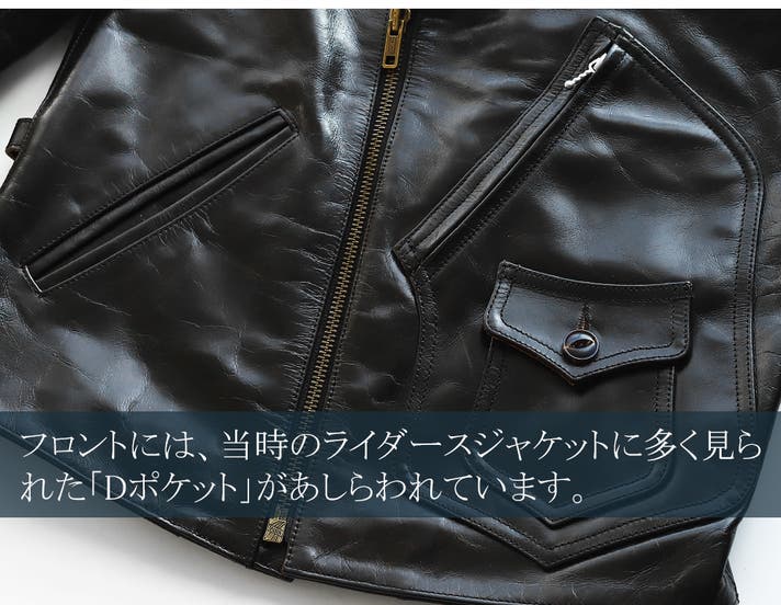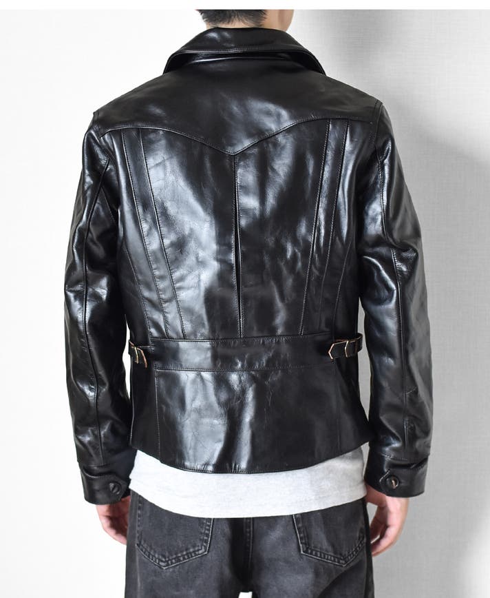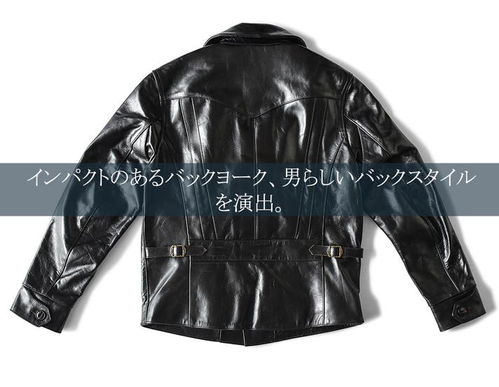 フロントの斜めジップやフラップ付きポケット、背面のウエスタン調ヨークなど、当時のディテールを忠実に再現。シンプルでありながらも存在感のある仕立ては、どの角度から見てもクラシックな迫力を漂わせます。また、アジャスター付きベルトが腰回りのシルエットを整え、タイトながらも快適なフィット感を実現しています。