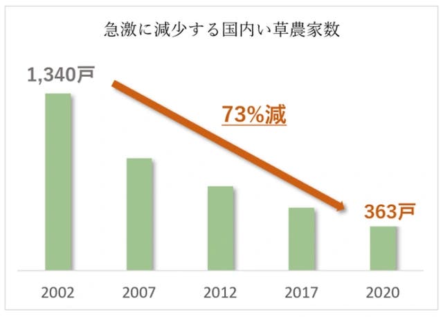 い草は、全国生産量の90%以上が熊本県内で生産されています。しかし、2002年には1,340戸あったい草農家さんは、2020年には363戸に減少…(※)