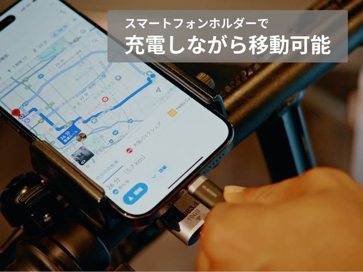 別途オプションのスマートフォンホルダーを設置いただければ、充電しながらの移動が可能に。