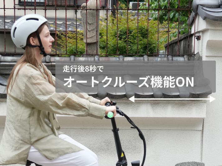 走行後約8秒でオートクルーズ機能がONに。アクセルを押し続けることなく、その速度で走行が可能。
