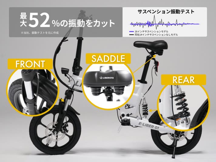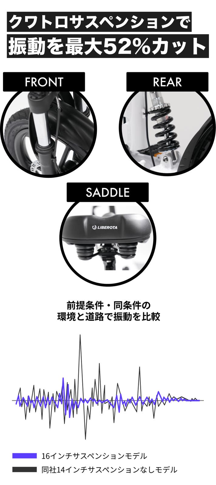 - 【圧倒的!乗り心地】16インチのタイヤとクワトロサスペンションシステムで振動を最大52%軽減
