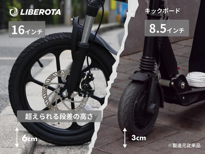 キックボードなどと比べて自転車同様に段差も安定して走行可能です。