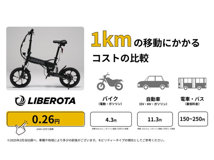 LIBEROTAは1回の充電で約10円で40km走行可能。公共交通機関やガソリン車と比較しても圧倒的なコストパフォーマンス。通勤・通学などの日常的な移動を、安価に快適に。