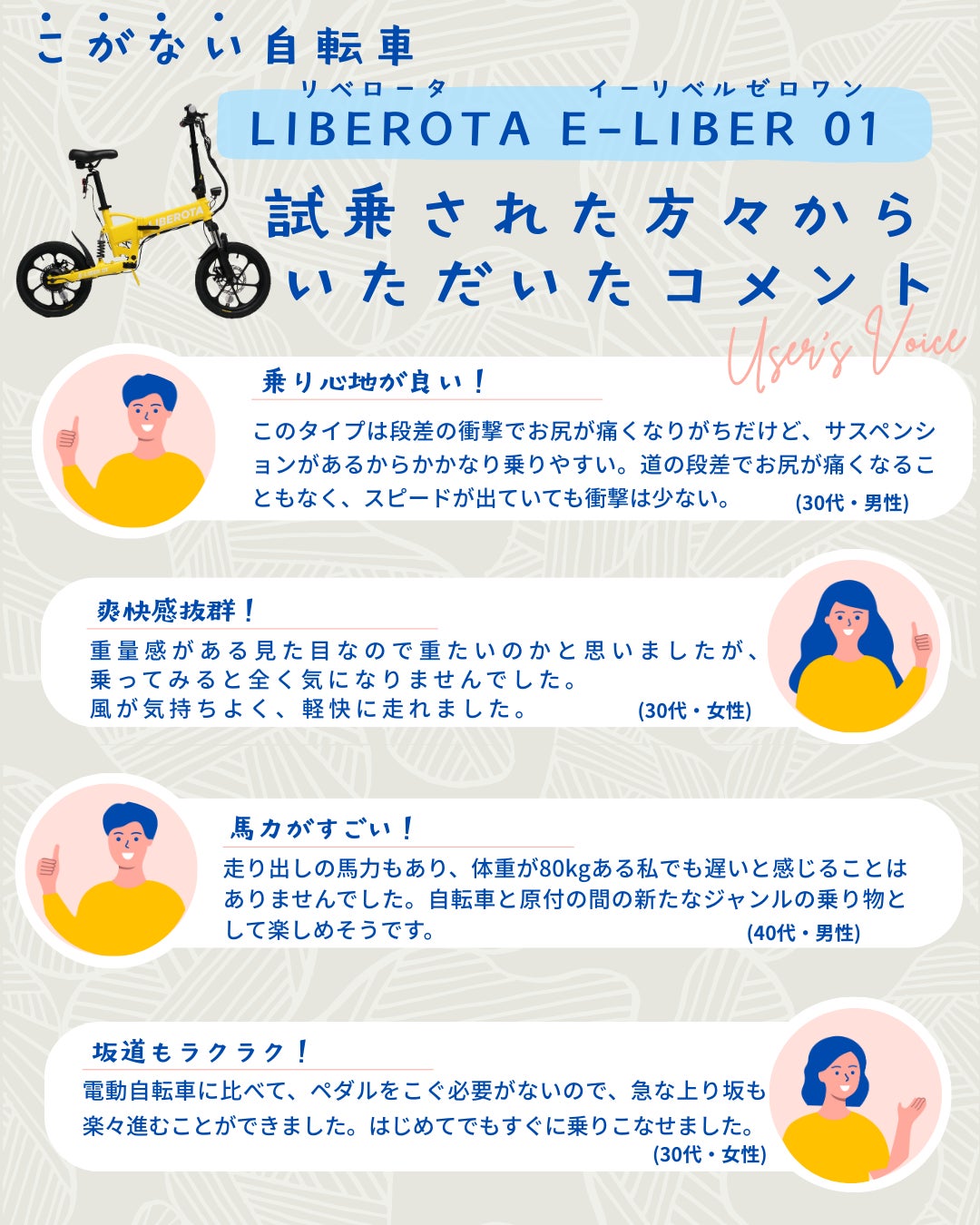 A. はい、試乗を企画しています。LIBEROTA本社や期間限定のポップアップストアなどで試乗可能です。詳しくは、LIBEROTA公式LINEからお問い合わせください。