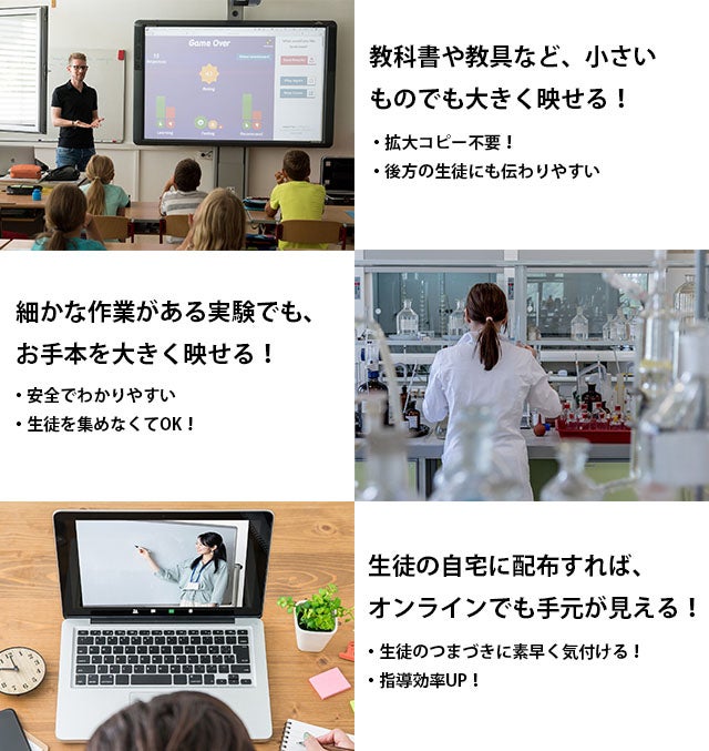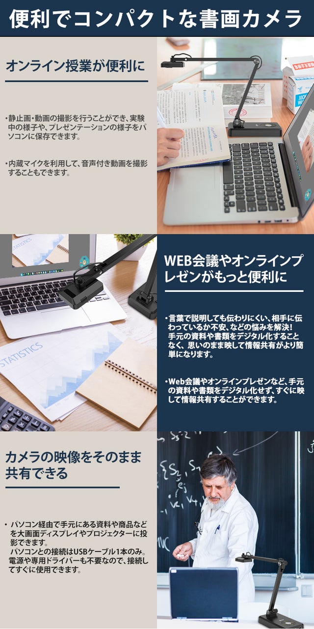 - USBケーブル1本で、すぐに使える書画カメラ USBで接続する、電源不要の書画カメラです。