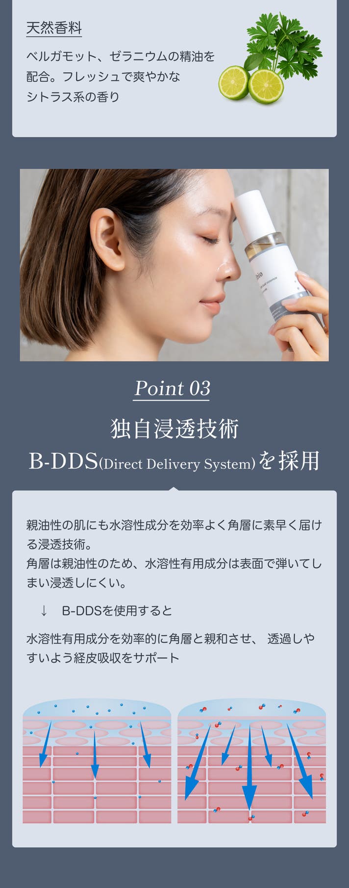 - 独自浸透技術(B-DDS )を採用。素早くしっかり角質層まで届ける。