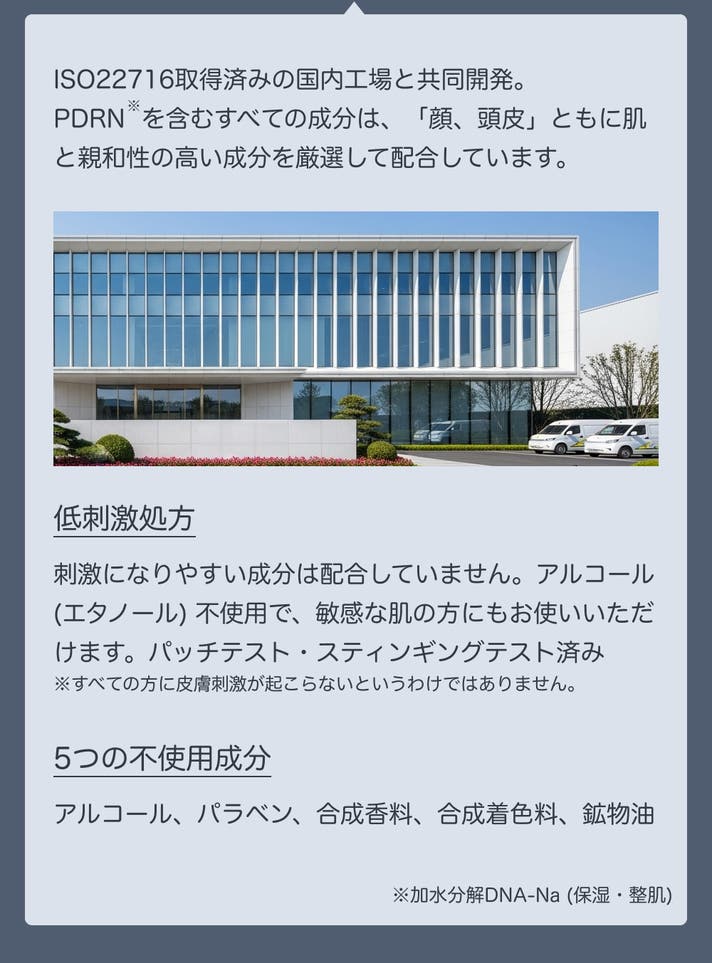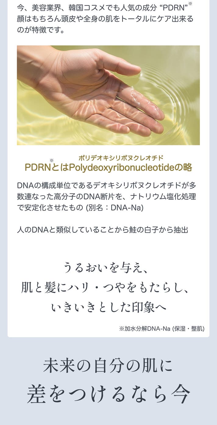 - 美容業界で話題の成分「PDRN」※を贅沢に配合。 ※加水分解DNA-Na(保湿、整肌)