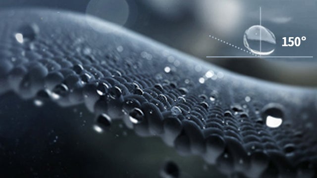 水滴が生地に接触する角度を150°に調整することで、水などの液体が付いても、水玉のように丸まり、ゴロゴロと転がり落ちるようになります。