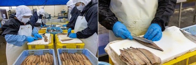とても手間ひまがかかることですが、機械では小骨まできちんと取り除くことが困難。この作業がうおとくの特徴でもあるので、泣きたい気持ちになるのも我慢してみんな頑張ってます!