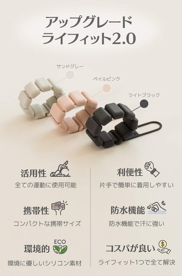ライフィットは LIFE + FIT と LIFE + ITを合わせて作りました言葉であり、1980年代から現在まで長く使われているリストウェイトからヒントを得て作りました商品です。