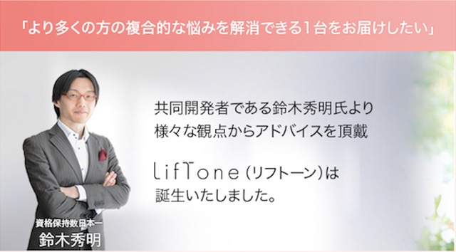 弊社では創業当初より家庭用美顔器の企画・販売に携わって参りました。お客様からお聞きするお悩みはまさに千差万別。さらに年齢に応じてお悩みも複雑に…「より多くの方の複合的な悩みを解消できる1台をお届けしたい」という願いから頭皮・髪・顔用美顔器LifTone(リフトーン)が誕生いたしました。