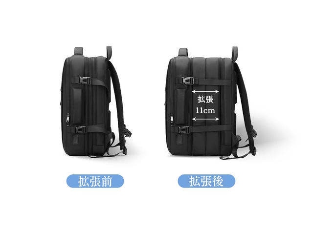 サイズ拡張前は通勤通学などの普段使いに最適で、サイズ拡張すれば出張や旅行用の大容量バッグになるので、このバッグひとつで2種類の用途でご使用いただけます。