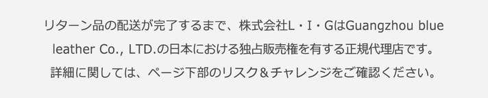 ◇株式会社L・I・Gは、本プロジェクトのリターン完了まで、Guangzhou blue leather Co., LTD.の製品を日本国内で独占販売する権利をもつ日本の正規代理店です。 ◇並行輸入品が発生する可能性があります。非正規の個人輸入等は、に防ぐことができない事がありますので、ご了承お願いいたします。 ◇並行輸入品は正規代理店によるサポートを受けられません。正規代理店は、国内で使用する製品に求められる認めを取得し、関税を適切に処置しています。 また、類似品が流通する場合があります。弊社では他社類似品についてのお問い合わせには対応できかねますのでご了承お願い致します。 ◇本文中のスケジュールは、プロジェクト公開時点での予定です。応援購入の性質上、配送遅延のおそれがございます。 ◇配送遅延に伴う応援購入のキャンセルは、原則として出来きませんが、リターン配送予定月から2ヵ月を超えた場合には、希望者の方にはキャンセル対応させていただきます。 【商品等の不具合による返品・交換】 ▪対応条件:不良状態詳細を確認し初期不良と判断の場合(リターン到着から90日以内) ▪返金額:交換または返金 ▪返品送料/再送料:弊社負担