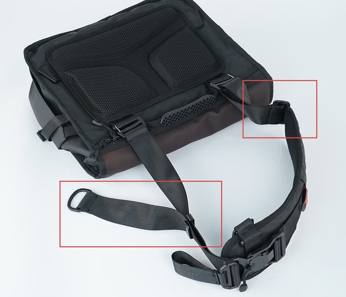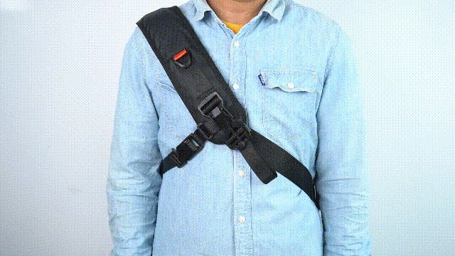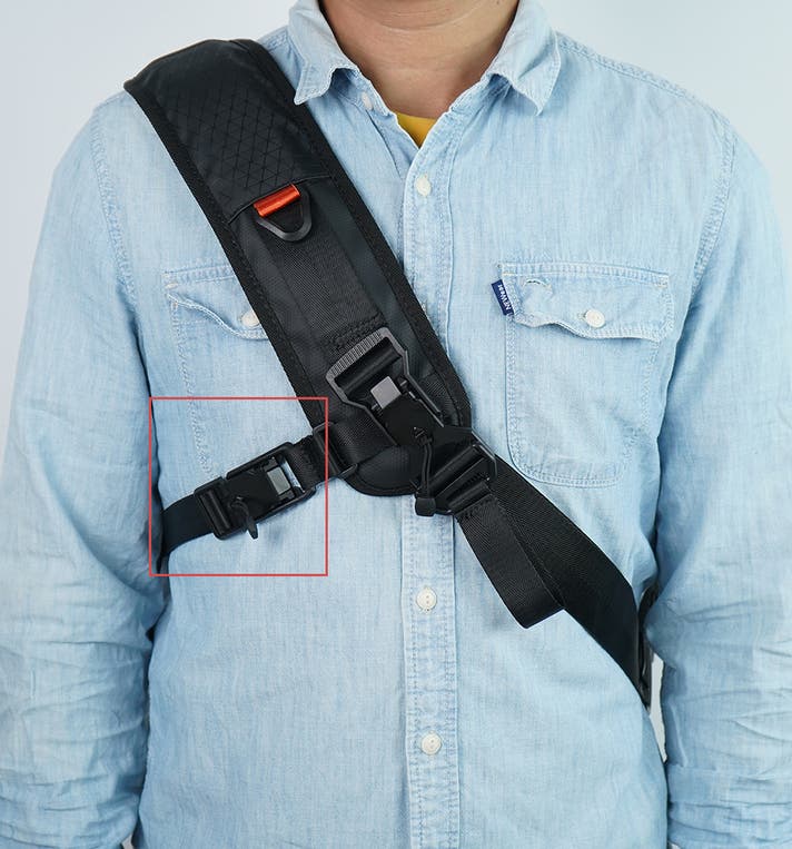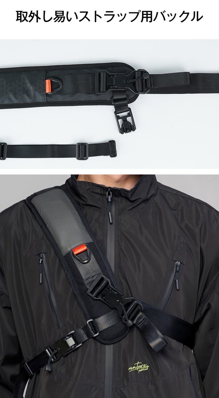 サブストラップは三点式固定する際にし使用します。重い荷物を運ぶ際に圧力を分散・軽減しキャリング状態を安定させます。 (クロスボディバッグスタイル時のみサポートします)。長さは約28cmから最大約46.5cmまで調節可能です。