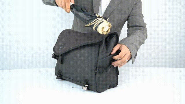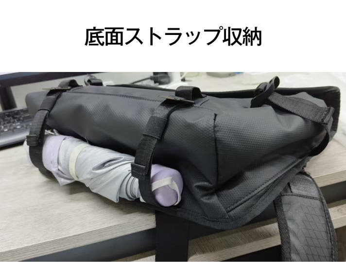 バッグ底面に2本のストラップがあり、折たたみ傘や三脚などの長物荷物の固定に最適です。長さのある荷物をメイン収納スペースに無理に押し込むことなく、スマートに持ち運ぶことができます。