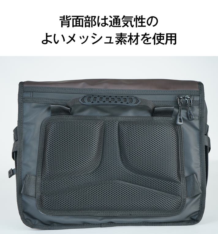 ショルダーストラップの背面とバッグの背面はハニカム状の通気性のよいメッシュ素材でデザインされています。熱を効率的に放出しドライな状態を保ちます。また程よいクッション性で体にフィットし移動中の揺れから荷物を保護します。