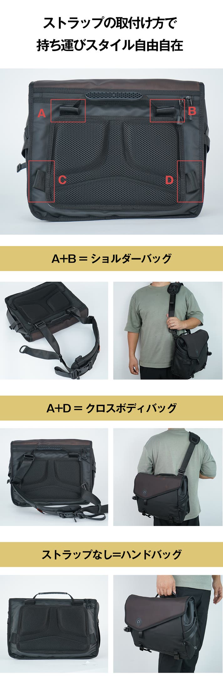 このバッグは、シーンや荷物の重さに応じて、好きなように使用できます。