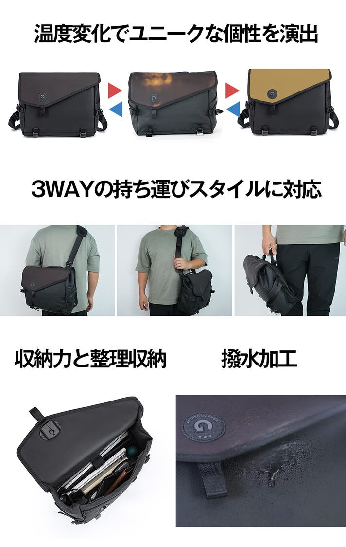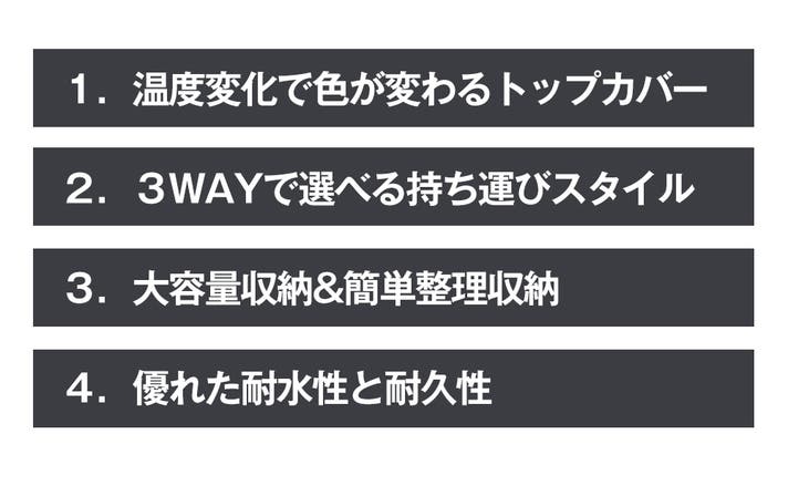 3WAYの持ち運びスタイルと、温度で色が変化するトップカバー、それでいて大容量で簡単整理収納できる「3WAYカラーチェンジバッグ」は、利便性と多用途性に加えて魅力的なカバーを備えたバッグです。このバッグでいつもの外出がより楽しくなります。