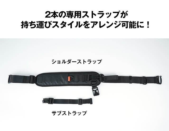 ショルダーストラップの長さを調整する事でショルダーバッグとクロスボディバッグの2スタイルの持ち方が可能。サブストラップはクロスボディバッグをしっかり固定させるキャリングストラップとしても使用できます。