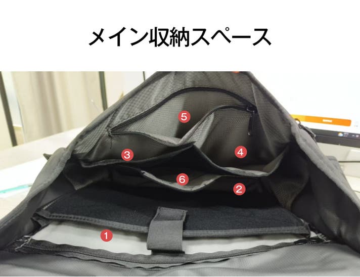 このバッグには収納用のポケットが複数付いており、アイテムを特定の場所に整理して収納できます。バッグの中で荷物がどこにあるか探すことなくアクセスできます。
