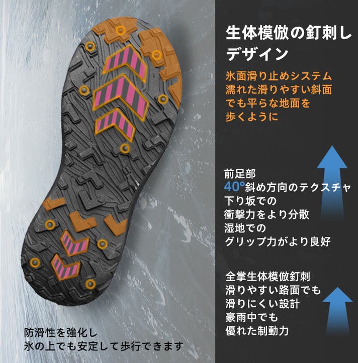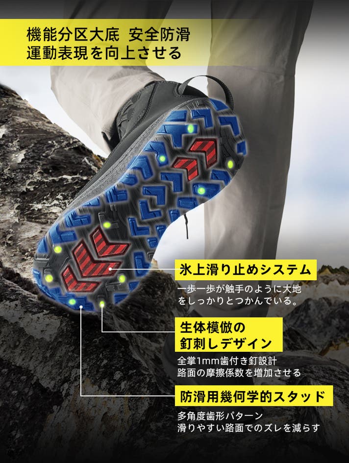 ソールには一体成型技術を採用。接着剤を使用せず、アッパーと一体化し、屈曲抵抗と柔軟性を大幅に向上させ、歩行時の安定性が向上します。