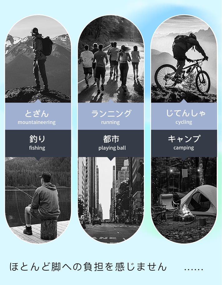 日常の歩行から、山岳ハイキングまで、足は常に優しく包み支えられます。
