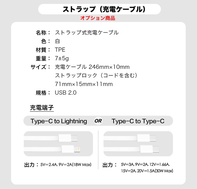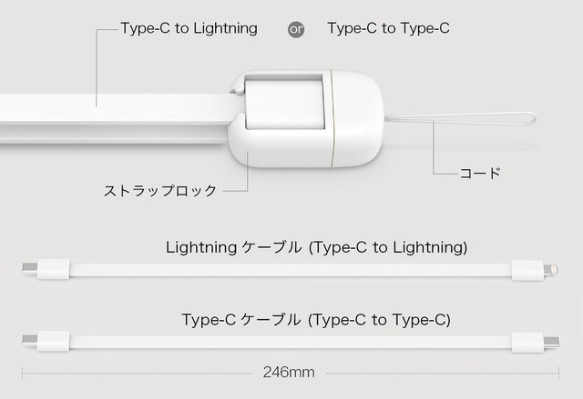 注意:ストラップ式充電ケーブルがオプション商品であるため、リターンにより、ストラップが付いていない場合があるので、ご応援購入になった際にリターンの内容物をご確認ください。