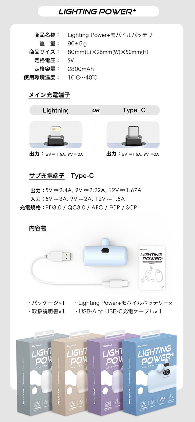 ※本製品の充電端子が、Type-CとiPhoneのLightningの2種類があります。商品名が、【LIGHTING POWER+】となり、商品説明においても沢山iPhoneの画像を使用していますが、iPhone専用ではありませんので、ご了承ください。