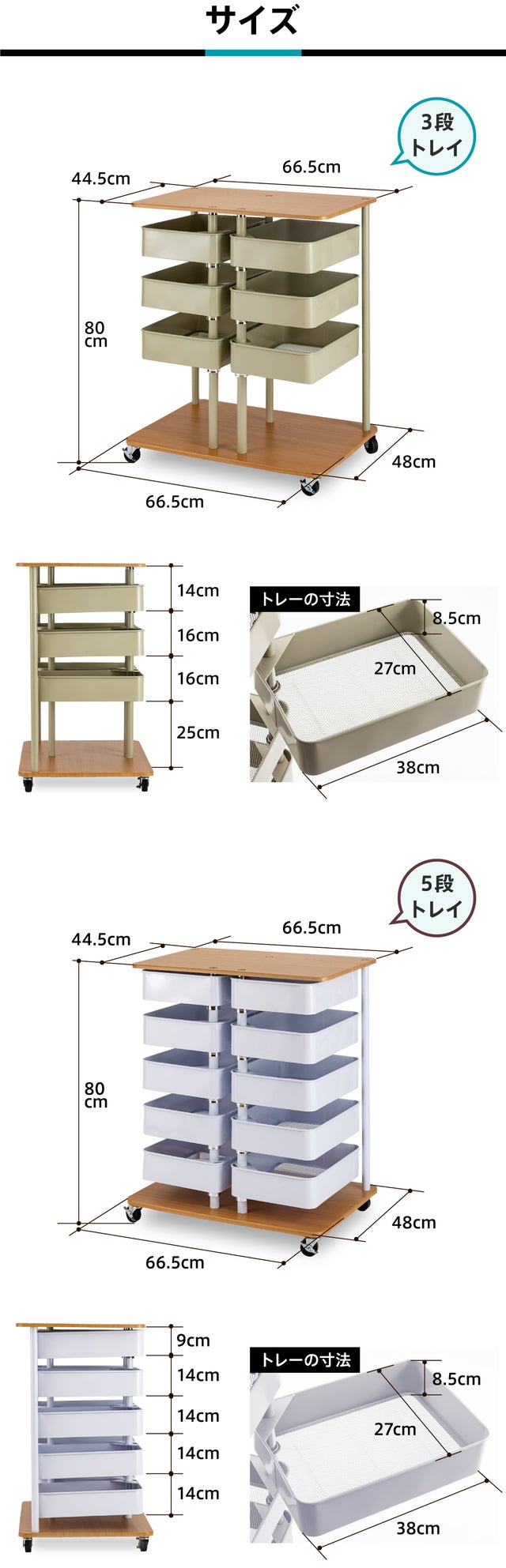 今回は、用途やお部屋のインテリアに合わせて選びやすい『3段』と『5段』の2列トレイをそれぞれ3カラーずつご用意しました。