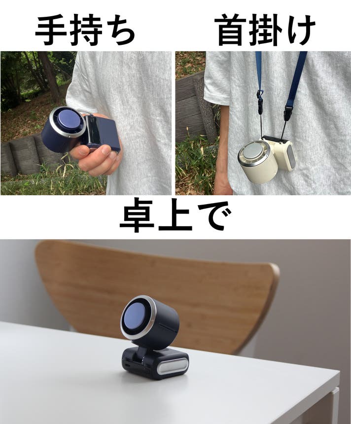 - 3WAY仕様!手持ち・首掛け・卓上の1台3役。どこにでも涼しさを持ち運べる。