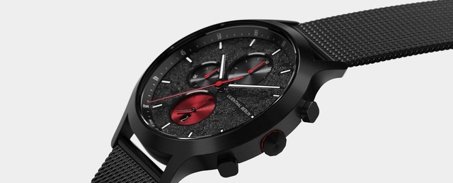 "The Chronograph VOLCANO I はブラックーボディに溶岩のような表面のブラック文字盤と赤をアクセントとしたスモセコ文字盤。
