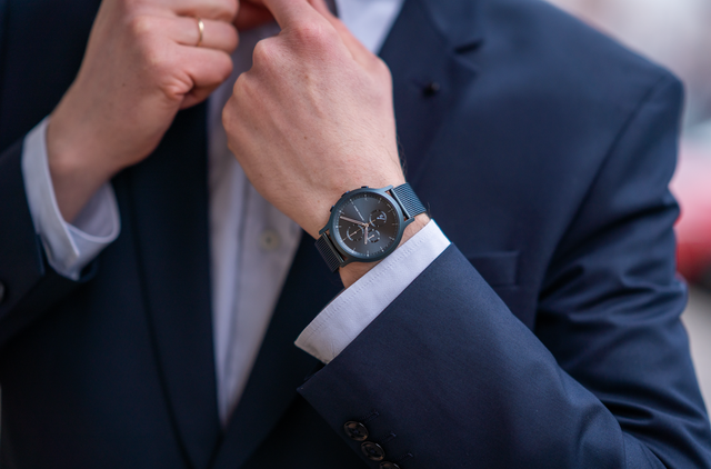 秒針の青と黒ケースが単なる大人の時計とは一線を画します。黒はどんな場面にも合う、もっとも多用途に使いこなせる色です。