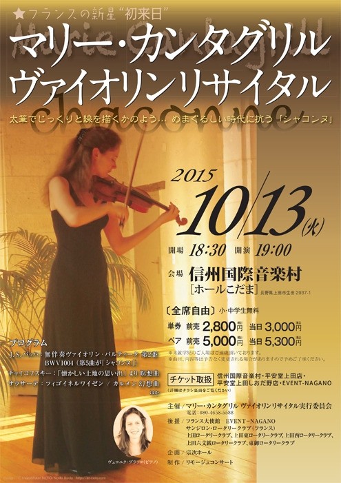 フランスの新星、ヴァイオリニスト「マリー・カンタグリル」初来日公演を成功させ!次の演奏家紹介へとつなげるためのプロジェクトです!