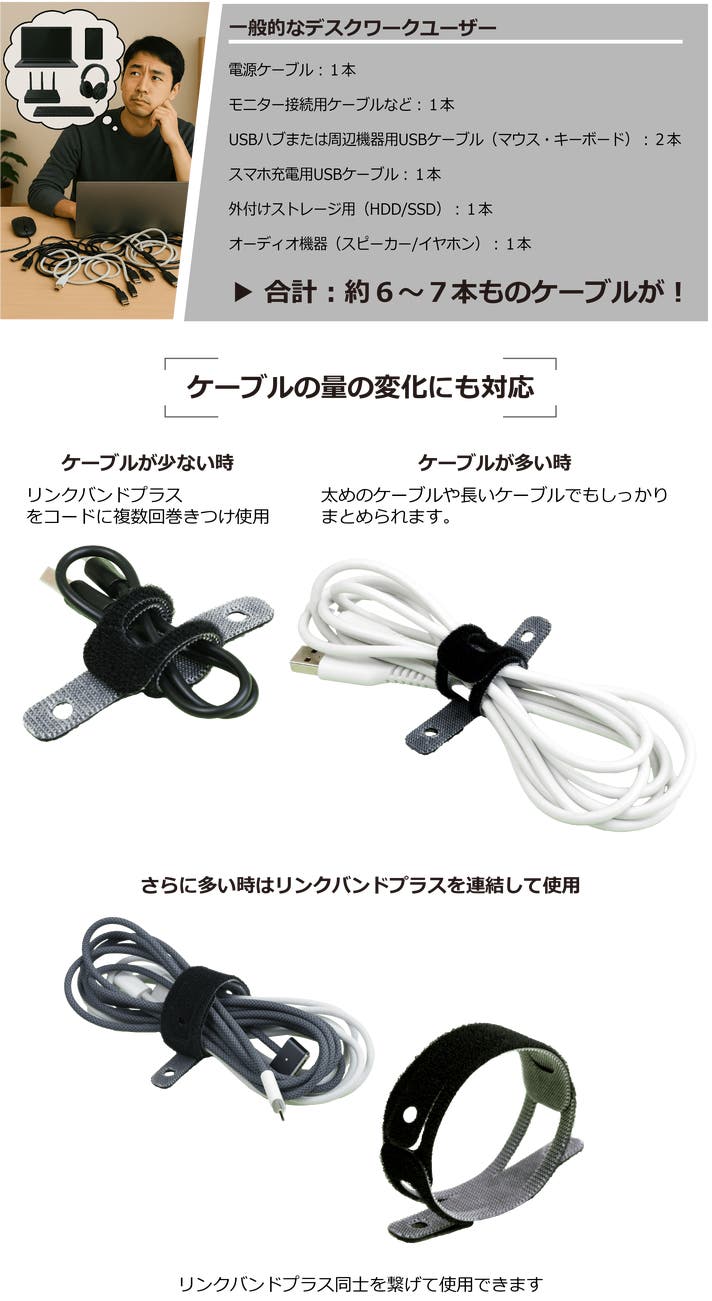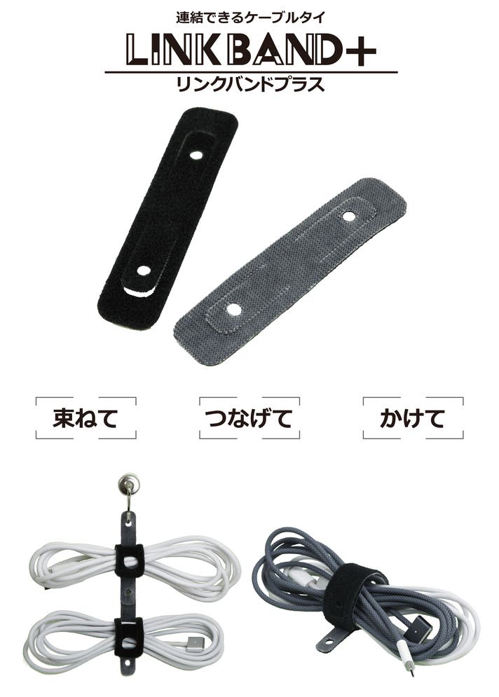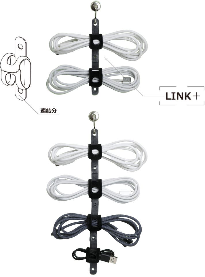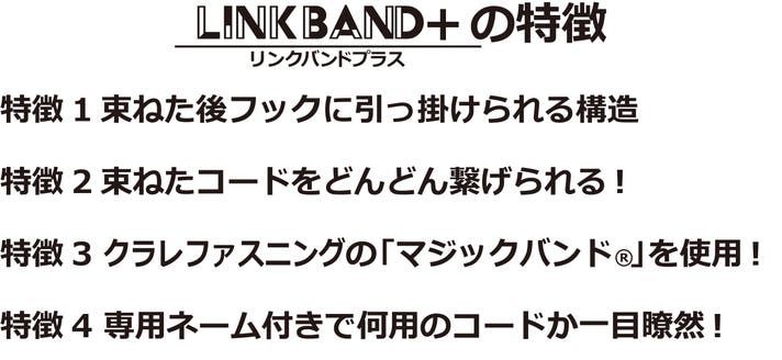 また、LINK BAND+〈リンクバンドプラス〉同士も繋げられるので、太いコードも束ねられます。