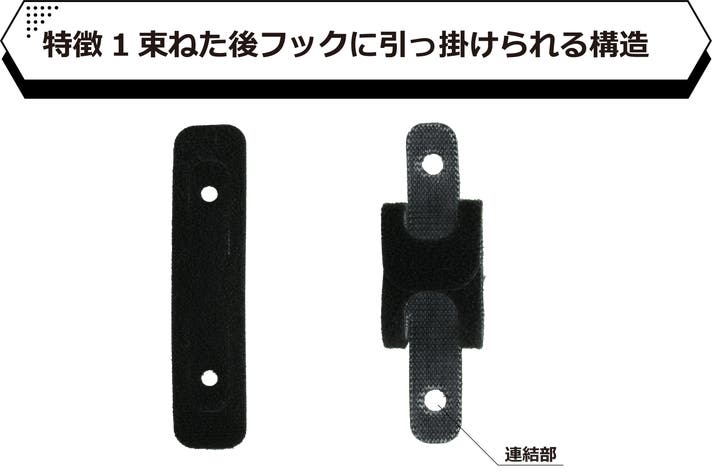 そんな日々の小さな不便を解決するために、「もっと簡単に整理できるアイテムはないか?」と考え、試行錯誤を重ねて生まれたのがこのケーブルタイです。面ファスナーを使うことで、ワンタッチでまとめることができるだけでなく、ホルダーに開けた穴を利用してフックに掛けて収納したり、複数のケーブルタイを連結したりと、これまでにない使い勝手を実現しました。