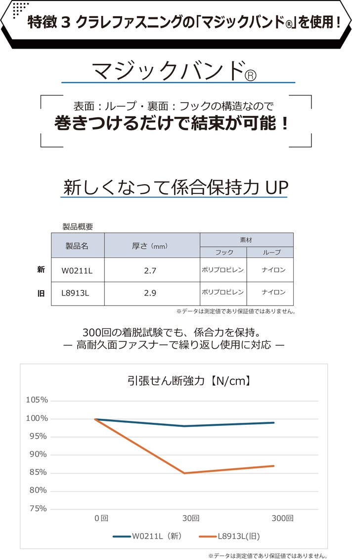 ・長期間使用すると、面ファスナーの粘着力が弱くなることがあります。定期的に点検し、必要に応じて交換してください。