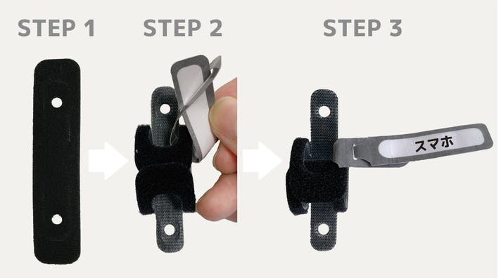 コードを結束してフックにかけられる形状。面ファスナー同士を連結できるので束ねたコード同士を繋げてスッキリ収納できます。専用タグにコードの用途も記載できるので、「このコード何用だったかな?」というお悩みもスッキリ解決します!