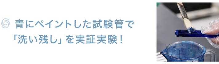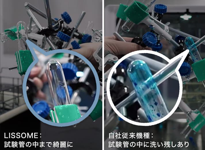 ▲複数の試験管の内側、外側を青色塗料で着色してから、様々な角度と位置に固定し、食洗機で実際に洗浄してみたところ、自社従来品では一部洗い残しがあったことに対し、「LISSOME J1」はご覧の通り、すべての試験管がキレイさっぱり洗浄できました。