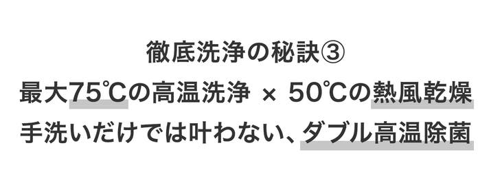 LISSOME J1は手洗いでは実現しにくい最大75℃の水温と、50℃の熱風乾燥で二重の安心ガード。「拭き作業」は不要。