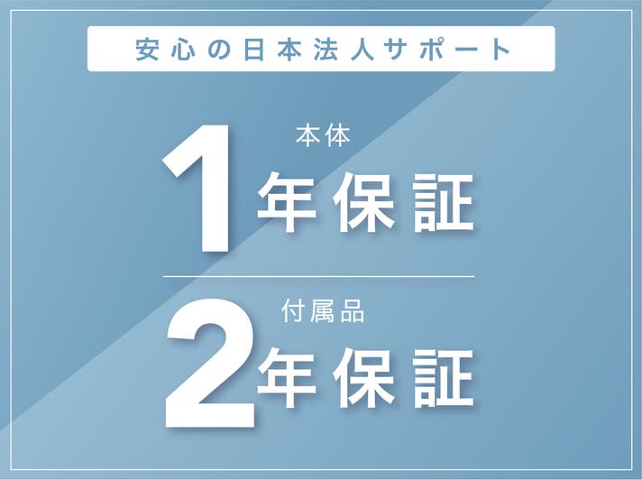 メーカー保証は、お届けから本体1年間、付属品は2年間の保証。
