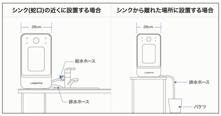 工事不要で極めてシンプル。排水ホースはシンクにもバケツにも、自由度高く設置可能。