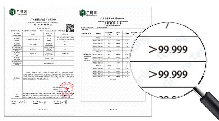 ▲中国微生物分析検測センターにて、「平均除菌率99.999%」の分析結果を取得。