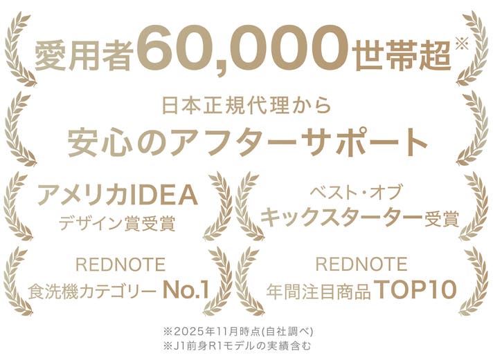 LISSOMEは2025年に旧モデルのR1を発表以来、狭いキッチンにも扱いやすいコンパクトさと高い洗浄力が評価され、瞬く間に出荷台数が60,000台を超え、様々なデザイン賞や人気賞を獲得しています。