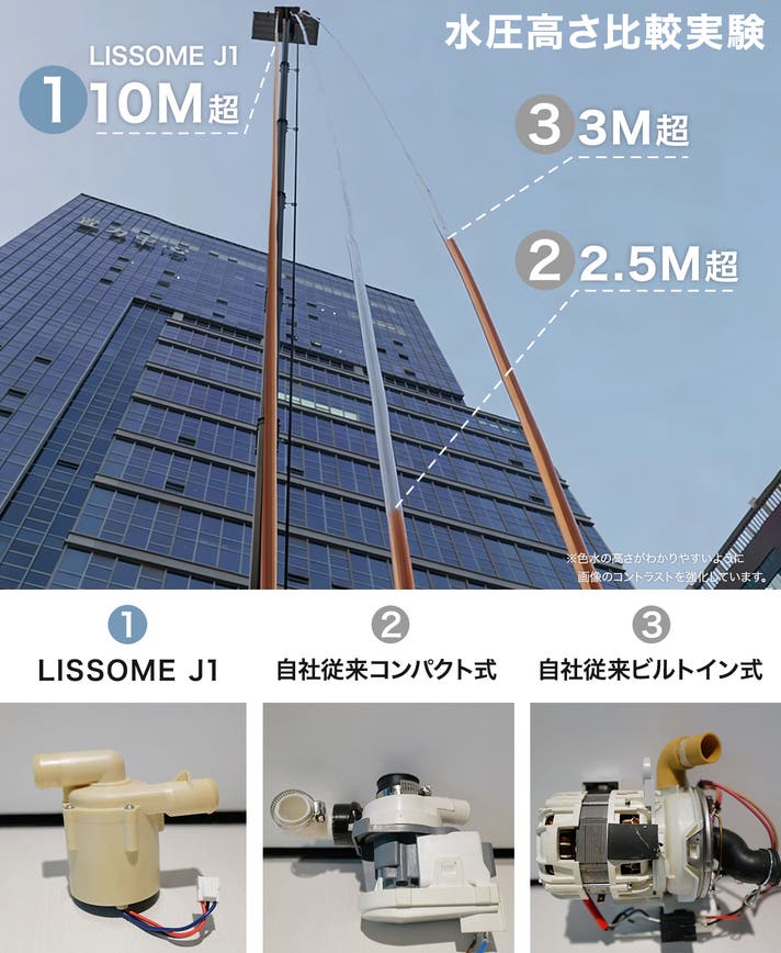 ②③が2.5m、3mの高さに留まったことに対し、①LISSOME独自設計のポンプは10メートル以上もの高さをキープ。