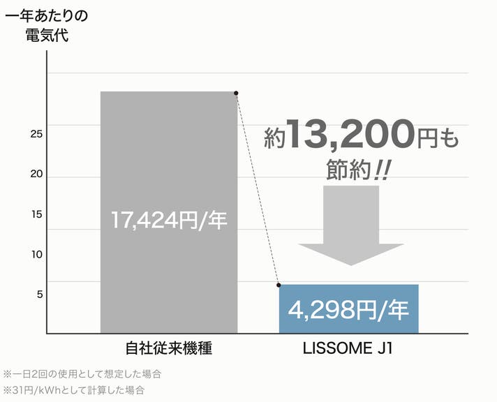LISSOMEは最小約0.19kWh/回の超省エネ設計。自社従来機種と比較して1日2回、31円/kWhとした場合、年間約13,200円もの電気代が節約になります!