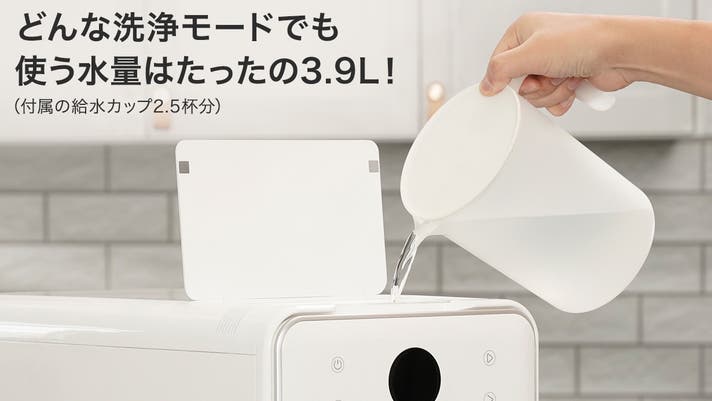付属の給水カップ約2.5杯分で、食器がピカピカに。