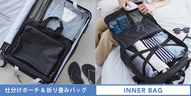 長距離旅行や海外旅行で、『行き』はLITE TRUNK BAGをスーツケースの中に折りたたんで予備バッグとして持ち運ぶことができ、『帰り』は増えてしまう荷物を小分けにして収納するとスーツケース中がすっきり 。