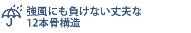 アルミ合金+グラスファイバーの強靭な骨を12本配置、強風の際にもしっかり雨傘の機能を発揮します。